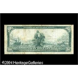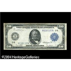 Fr. 1031a $50 1914 Federal Reserve Note Fine-Very Fin <B>Fr. 1031a $50 1914 Federal Reserve Note Fine-Very Fine.</B></I> Problem-free from the face, but with a few very light stains on the back. <BR><BR><B>Important notice:</B> Heritage usually auctions material at the rate of 200-250 lots per hour. On some occasions eBay Live bid software or the Internet may not be able to keep up with the pace of the auction. We recommend placing a realistic absentee bid now as insurance to avoid disappointment. Occasionally the auctioneer may eliminate or reject an eBay Live bid, and the auctioneer may also reopen a lot after the close of the eBay live bidding (usually because we missed an audience bid), and may reject your bid even if it shows you as the winning bidder. By bidding via eBay Live, you agree that Heritage may award the lot to another bidder at its sole discretion under the circumstances described above or any other reasonable circumstances. Since eBay bids are not shown to us until we open the lot on the floor, we treat those bids just like floor bids. In most cases the floor responds before the eBay bid is presented to us, due to Internet lag time, so for consistency we have made it a policy that floor bids are always considered first over tie eBay live bids. Also please note that all Heritage lots purchased through eBay Live carry a 20% Buyer's Premium. Please make sure you read the Terms and Conditions before you bid. This lot is being auctioned in conjunction with a live floor auction by Heritage Galleries & Auctioneers. All final auction and invoice information will be supplied by Heritage Galleries & Auctioneers, and all other information should be considered preliminary. Lot:17756