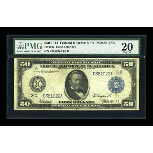 <B>Fr. 1032 $50 1914 Federal Reserve Note PMG Very Fine 20.</B></I> Broad margins and full remaining details are noted on this issue. To date, fewer than two dozen notes have been reported to census takers.<BR><BR><b>Shipping:</b> Coins & Currency (<a target="_blank" href="http://www.heritageauctions.com/common/shipping.php">view shipping information</a>)