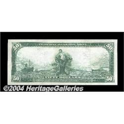 Fr. 1032 $50 1914 Federal Reserve Note Superb Gem New. This is only the third example of this number that we've sold, and it's one of just about a dozen known to us. It's been off the market since the March 1991 Stack's sale, where it was acquired by our consignor. Deep, original embossing, Superb centering and terrific eye appeal combine to make this one of the nicest $50 Feds we've handled. A beautiful piece. <BR><BR><B>Important notice:</B> Heritage usually auctions material at the rate of 200-250 lots per hour. On some occasions eBay Live bid software or the Internet may not be able to keep up with the pace of the auction. We recommend placing a realistic absentee bid now as insurance to avoid disappointment. Occasionally the auctioneer may eliminate or reject an eBay Live bid, and the auctioneer may also reopen a lot after the close of the eBay live bidding (usually because we missed an audience bid), and may reject your bid even if it shows you as the winning bidder. By bidding via eBay Live, you agree that Heritage may award the lot to another bidder at its sole discretion under the circumstances described above or any other reasonable circumstances. Since eBay bids are not shown to us until we open the lot on the floor, we treat those bids just like floor bids. In most cases the floor responds before the eBay bid is presented to us, due to Internet lag time, so for consistency we have made it a policy that floor bids are always considered first over tie eBay live bids. Also please note that all Heritage lots purchased through eBay Live carry a 20% Buyer's Premium. Please make sure you read the Terms and Conditions before you bid. <BR><BR><B>IMPORTANT ANNOUNCEMENT ABOUT RESERVES:</B> Heritage now divulges all reserves on its web site 7 days before every auction. If you want to know whether the reserve on this lot has been met, and if not, what the reserve amount is, please visit this lot page on the HeritageCoin.com web site, or email: bid@HeritageGalleries.com