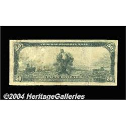Fr. 1033 $50 1914 Federal Reserve Note Fine, Damaged. The very first example that we've handled out of a total census of four. The note has some problems to be sure. The right edge has been restored using a piece from another note, and a number of holes have been plugged, but the note has a decent appearance in spite of its problems. When rarity of this kind is encountered, grade becomes a secondary consideration. We would expect this piece to realize . . . <BR><BR><B>Important notice:</B> Heritage usually auctions material at the rate of 200-250 lots per hour. On some occasions eBay Live bid software or the Internet may not be able to keep up with the pace of the auction. We recommend placing a realistic absentee bid now as insurance to avoid disappointment. Occasionally the auctioneer may eliminate or reject an eBay Live bid, and the auctioneer may also reopen a lot after the close of the eBay live bidding (usually because we missed an audience bid), and may reject your bid even if it shows you as the winning bidder. By bidding via eBay Live, you agree that Heritage may award the lot to another bidder at its sole discretion under the circumstances described above or any other reasonable circumstances. Since eBay bids are not shown to us until we open the lot on the floor, we treat those bids just like floor bids. In most cases the floor responds before the eBay bid is presented to us, due to Internet lag time, so for consistency we have made it a policy that floor bids are always considered first over tie eBay live bids. Also please note that all Heritage lots purchased through eBay Live carry a 20% Buyer's Premium. Please make sure you read the Terms and Conditions before you bid. <BR><BR><B>IMPORTANT ANNOUNCEMENT ABOUT RESERVES:</B> Heritage now divulges all reserves on its web site 7 days before every auction. If you want to know whether the reserve on this lot has been met, and if not, what the reserve amount is, please visit this lot page on the HeritageCoin.com web site, or email: bid@HeritageGalleries.com