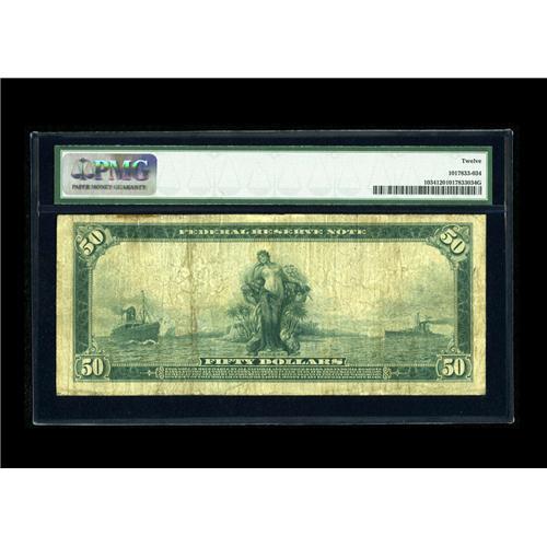 <B>Fr. 1034 $50 1914 Federal Reserve Note PMG Fine 12.</B></I> A total of about 40 notes are known for this issue. This piece shows some roughness in the top margin and a couple of pinholes, but is otherwise solid. <BR><I>Ex: Rickey Collection</B></I><BR><BR><b>Shipping:</b> Coin/Currency (<a target="_blank" href="http://www.heritageauctions.com/common/shipping.php">view shipping information</a>)
