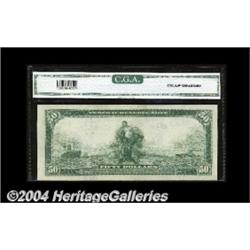 Fr. 1035 $50 1914 Federal Reserve Note CGA Choice New 64. A lovely Fifty, apparently held from the Gem grade only by a slightly tight top margin. The colors are spectacular, and the original embossing can be seen through the third-party holder. 1035 is one of the more common $50 Fed numbers, which makes this piece an ideal candidate for a type set. <BR><BR><B>Important notice:</B> Heritage usually auctions material at the rate of 200-250 lots per hour. On some occasions eBay Live bid software or the Internet may not be able to keep up with the pace of the auction. We recommend placing a realistic absentee bid now as insurance to avoid disappointment. Occasionally the auctioneer may eliminate or reject an eBay Live bid, and the auctioneer may also reopen a lot after the close of the eBay live bidding (usually because we missed an audience bid), and may reject your bid even if it shows you as the winning bidder. By bidding via eBay Live, you agree that Heritage may award the lot to another bidder at its sole discretion under the circumstances described above or any other reasonable circumstances. Since eBay bids are not shown to us until we open the lot on the floor, we treat those bids just like floor bids. In most cases the floor responds before the eBay bid is presented to us, due to Internet lag time, so for consistency we have made it a policy that floor bids are always considered first over tie eBay live bids. Also please note that all Heritage lots purchased through eBay Live carry a 20% Buyer's Premium. Please make sure you read the Terms and Conditions before you bid. <BR><BR><B>IMPORTANT ANNOUNCEMENT ABOUT RESERVES:</B> Heritage now divulges all reserves on its web site 7 days before every auction. If you want to know whether the reserve on this lot has been met, and if not, what the reserve amount is, please visit this lot page on the HeritageCoin.com web site, or email: bid@HeritageGalleries.com