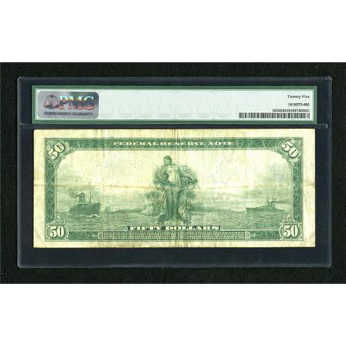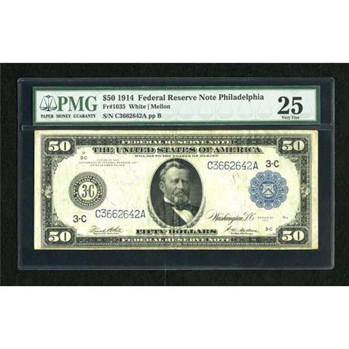 <B>Fr. 1035 $50 1914 Federal Reserve Note PMG Very Fine 25.</B></I> The paper quality is most pleasing for the grade with a bright overprint and deeply printed details.<BR><BR><b>Shipping:</b> Coins & Currency (<a target="_blank" href="http://www.heritageauctions.com/common/shipping.php">view shipping information</a>)