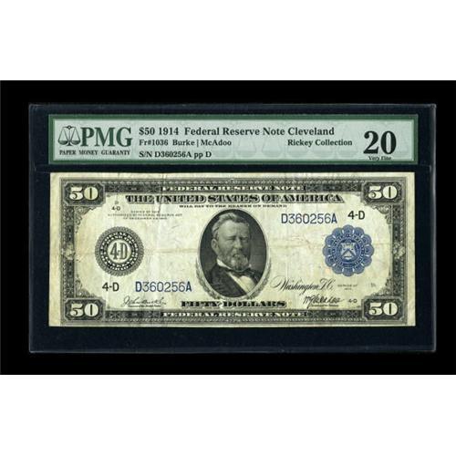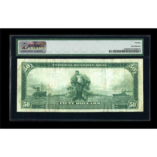 <B>Fr. 1036 $50 1914 Federal Reserve Note PMG Very Fine 20.</B></I> This note boasts a lot of eye appeal for an average circulated issue.<BR><BR><b>Shipping:</b> Coins & Currency (<a target="_blank" href="http://www.heritageauctions.com/common/shipping.php">view shipping information</a>)