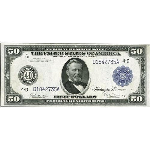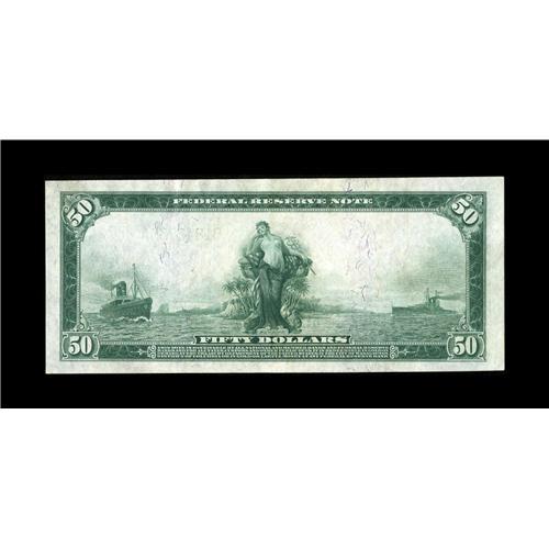 <B>Fr. 1037 $50 1914 Federal Reserve Note Extremely Fine-About New.</B></I> Around ten serial numbers have been recorded for this Friedberg number as of this writing. This example is newly discovered and it carries a higher grade than any Fr. 1037 note in the census. A great, rare note with light circulation.