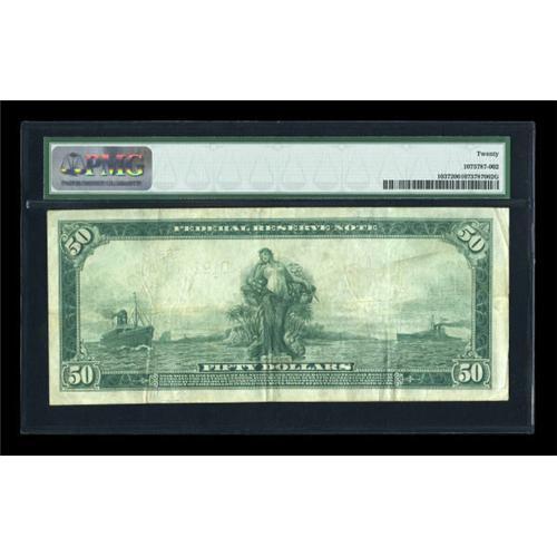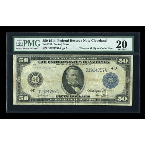 <B>Fr. 1037 $50 1914 Federal Reserve Note PMG Very Fine 20.</B></I> This Burke-Glass Cleveland Fifty is represented in the census by just 26 examples. This one was not previously listed and is a new high serial number.<BR><I>From The Thomas M. Flynn Collection</B></I><BR><BR><b>Shipping:</b> Coins & Currency (<a target="_blank" href="http://www.heritageauctions.com/common/shipping.php">view shipping information</a>)