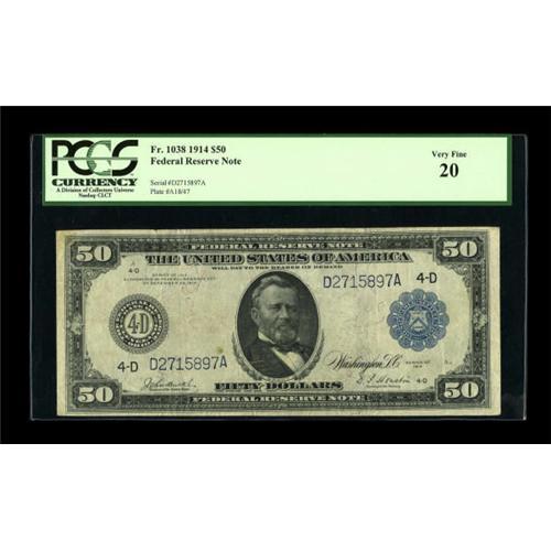 <B>Fr. 1038 $50 1914 Federal Reserve Note PCGS Very Fine 20.</B></I> A Cleveland example that is nice, colorful and problem free for the grade.<BR><BR><b>Shipping:</b> Coins & Currency (<a target="_blank" href="http://www.heritageauctions.com/common/shipping.php">view shipping information</a>)