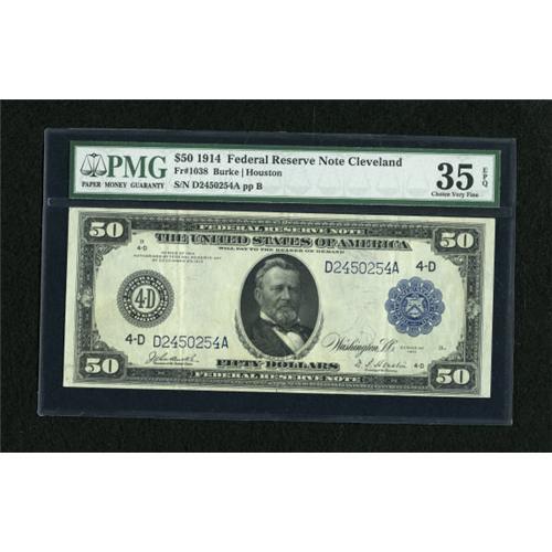 <B>Fr. 1038 $50 1914 Federal Reserve Note PMG Choice Very Fine 35 EPQ.</B></I> One fold too many is noted on this Cleveland issue.<BR><BR><b>Shipping:</b> Coins & Currency (<a target="_blank" href="http://www.heritageauctions.com/common/shipping.php">view shipping information</a>)