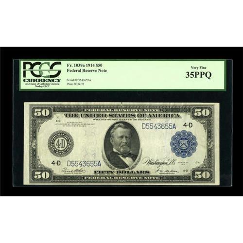 <B>Fr. 1039a $50 1914 Federal Reserve Note PCGS Very Fine 35PPQ.</B></I> A nice clearly natural VF with good color, and broad margins. <BR><BR><b>Shipping:</b> Coins & Currency (<a target="_blank" href="http://www.heritageauctions.com/common/shipping.php">view shipping information</a>)
