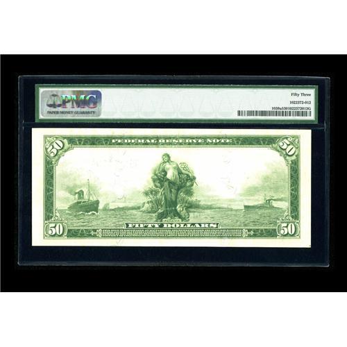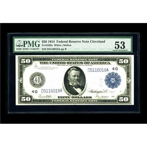 <B>Fr. 1039a $50 1914 Federal Reserve Note PMG About Uncirculated 53.</B></I> Not a terribly scarce note overall, but finding a pleasing example in a higher grade proves daunting. Bright, well margined, and plenty of eye appeal best describe this Cleveland $50 FRN.<BR><I>From The Collection of Daniel Weissman</B></I><BR><BR><b>Shipping:</b> Coin/Currency (<a target="_blank" href="http://www.heritageauctions.com/common/shipping.php">view shipping information</a>)