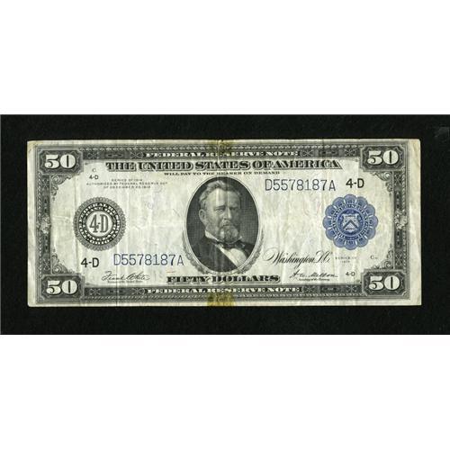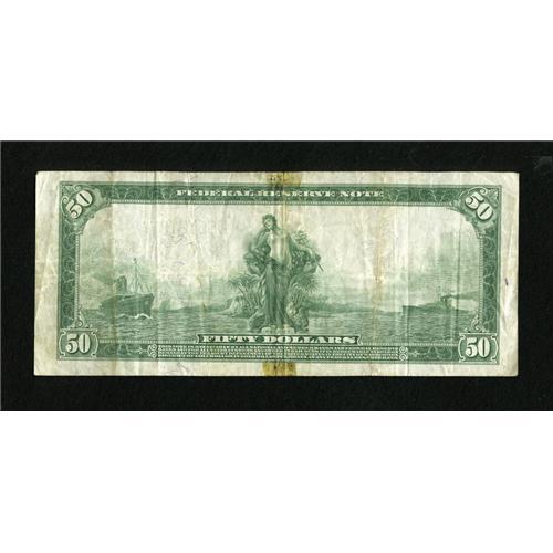 <B>Fr. 1039a $50 1914 Federal Reserve Note Very Fine.</B></I> This otherwise fully original issue shows some tape remnants near the margins of the centerfold.<BR><BR><b>Shipping:</b> Coins & Currency (<a target="_blank" href="http://www.heritageauctions.com/common/shipping.php">view shipping information</a>)