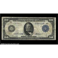 Fr. 1039b $50 1914 Federal Reserve Note CGA Very Fine 20. The "b" type is quite a bit scarcer, particularly so in the higher denominations. Important notice: We expect to be auctioning lots at the rate of 200-250 per hour. Sometimes eBay Premier live bid software cannot keep up with that pace, so we strongly recommend that you place a realistic proxy bid now as insurance to avoid disappointment. Also please note that all Heritage/CAA lots purchased through eBay Premier carry a 20% Buyer's Premium. Please make sure you read the Terms and Conditions.