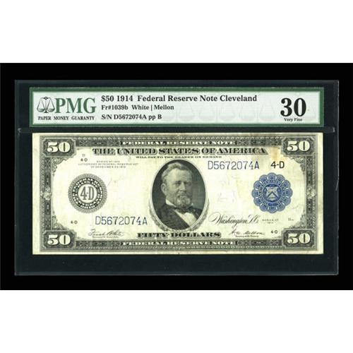 <B>Fr. 1039b $50 1914 Federal Reserve Note PMG Very Fine 30.</B></I> Four folds and some faint handling account for the grade on this bright issue.<BR><BR><b>Shipping:</b> Coins & Currency (<a target="_blank" href="http://www.heritageauctions.com/common/shipping.php">view shipping information</a>)