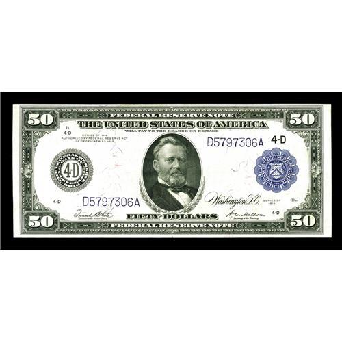 <B>Fr. 1039b $50 1914 Federal Reserve Note Very Fine.</B></I> This Cleveland $50 is from the much scarcer "b" variety for this signature combination. In fact, the ratio is slightly over two to one in favor of the "a" variety when it comes to the number of notes in the census.