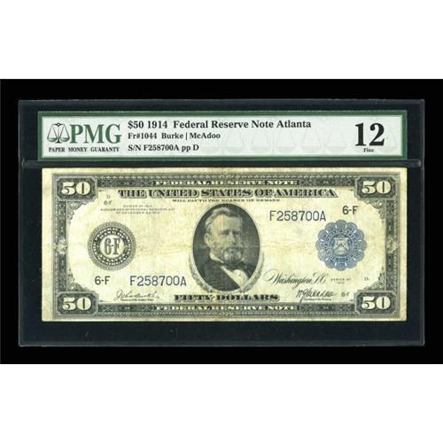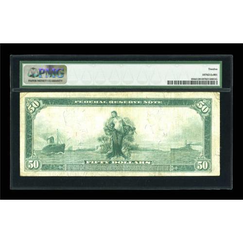 <B>Fr. 1044 $50 1914 Federal Reserve Note PMG Fine 12.</B></I> Fewer than two dozen examples of this issue have been reported in the collecting community. Until this year, the last example of this issue that had been offered at auction was in 2003.<BR><BR><b>Shipping:</b> Coins & Currency (<a target="_blank" href="http://www.heritageauctions.com/common/shipping.php">view shipping information</a>)