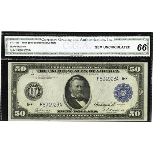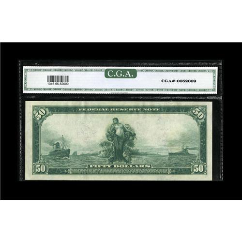 <B>Fr. 1046 $50 1914 Federal Reserve Note CGA Gem Uncirculated 66.</B></I> A gorgeous Fifty Dollar Fed with ideal color, broad, even margins and perfect centering of both sides.