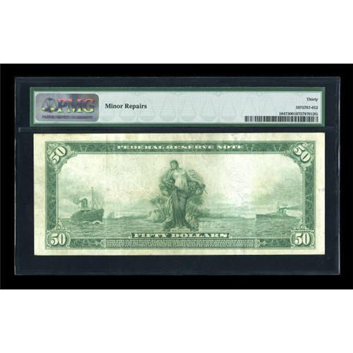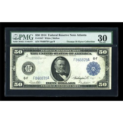<B>Fr. 1047 $50 1914 Federal Reserve Note PMG Very Fine 30.</B></I> This White-Mellon Atlanta Fifty is listed by PMG as having "Minor Repairs." There are two splits at the left edge that have been closed. It's a scarce number, with only 21 (now 22) pieces in the census.<BR><I>From The Thomas M. Flynn Collection</B></I><BR><BR><b>Shipping:</b> Coins & Currency (<a target="_blank" href="http://www.heritageauctions.com/common/shipping.php">view shipping information</a>)