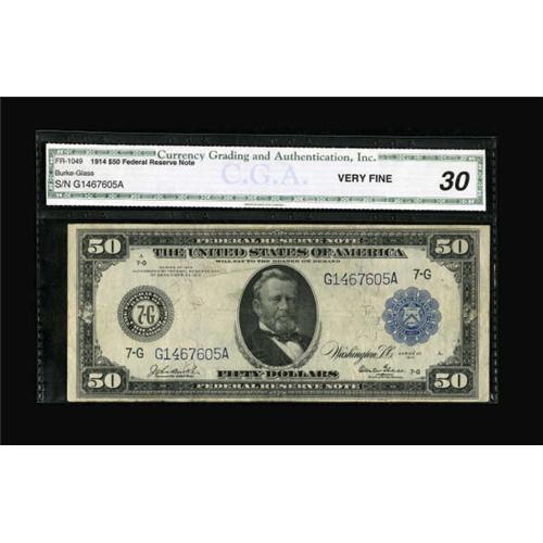 <B>Fr. 1049 $50 1914 Federal Reserve Note CGA Very Fine 30.</B></I> Less than 50 examples are known of this Friedberg number. A lone pinhole may be the only distraction to mention.<BR><BR><b>Shipping:</b> Coins & Currency (<a target="_blank" href="http://www.heritageauctions.com/common/shipping.php">view shipping information</a>)