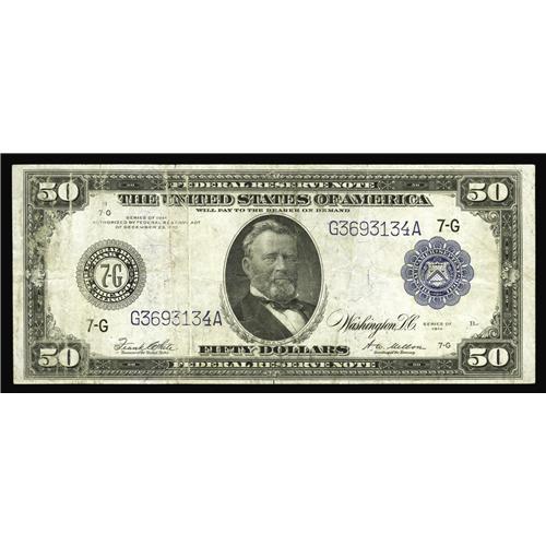 <B>Fr. 1051 $50 1914 Federal Reserve Note Very Fine.</B></I> Being from the Chicago district one would assume there would be numerous examples available. Not so, as there are less than 30 examples known.