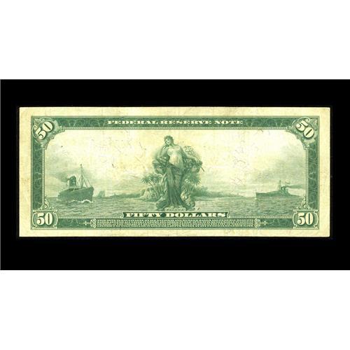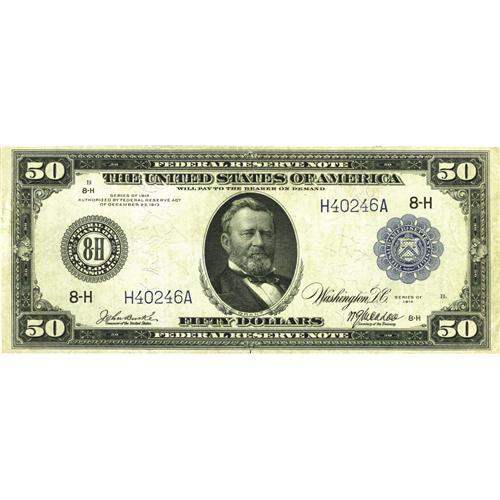 <B>Fr. 1052 $50 1914 Federal Reserve Note Very Fine+.</B></I> Decent margins and good color are seen on this tough Burke-McAdoo signed note. It was sold last year where it realized $862.50. Expect a realization in the area of...