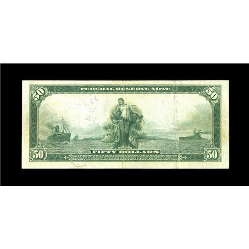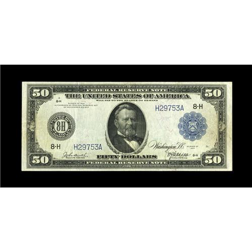 <B>Fr. 1052 $50 1914 Federal Reserve Note Very Fine.</B></I> Fewer than two dozen examples of this $50 are known to collectors. While the median grade is VF, we must stress that this is an attractive and wholly original example for the grade.<BR><BR><b>Shipping:</b> Coin/Currency (<a target="_blank" href="http://www.heritageauctions.com/common/shipping.php">view shipping information</a>)
