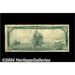 Fr. 1053 $50 1914 Federal Reserve Note Fine. This is only the second example of this rare number that we have handled. The surfaces are a trifle soft, and there is a little staining on the back, but the rarity should carry this note to or past . . . <BR><BR><B>Important notice:</B> Heritage usually auctions material at the rate of 200-250 lots per hour. On some occasions eBay Live bid software or the Internet may not be able to keep up with the pace of the auction. We recommend placing a realistic absentee bid now as insurance to avoid disappointment. Occasionally the auctioneer may eliminate or reject an eBay Live bid, and the auctioneer may also reopen a lot after the close of the eBay live bidding (usually because we missed an audience bid), and may reject your bid even if it shows you as the winning bidder. By bidding via eBay Live, you agree that Heritage may award the lot to another bidder at its sole discretion under the circumstances described above or any other reasonable circumstances. Since eBay bids are not shown to us until we open the lot on the floor, we treat those bids just like floor bids. In most cases the floor responds before the eBay bid is presented to us, due to Internet lag time, so for consistency we have made it a policy that floor bids are always considered first over tie eBay live bids. Also please note that all Heritage lots purchased through eBay Live carry a 20% Buyer's Premium. Please make sure you read the Terms and Conditions before you bid. <BR><BR><B>IMPORTANT ANNOUNCEMENT ABOUT RESERVES:</B> Heritage now divulges all reserves on its web site 7 days before every auction. If you want to know whether the reserve on this lot has been met, and if not, what the reserve amount is, please visit this lot page on the HeritageCoin.com web site, or email: bid@HeritageGalleries.com