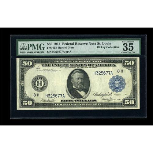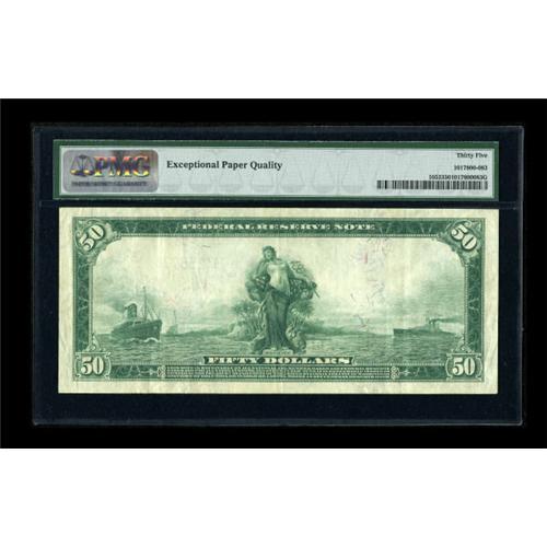 <B>Fr. 1053 $50 1914 Federal Reserve Note PMG Choice Very Fine 35 EPQ.</B></I> A most pleasing example of this number which has only about thirty survivors known to collectors.<BR><BR><b>Shipping:</b> Coins & Currency (<a target="_blank" href="http://www.heritageauctions.com/common/shipping.php">view shipping information</a>)