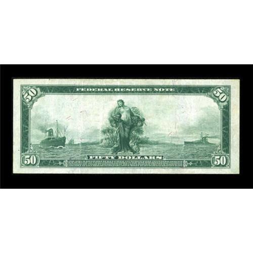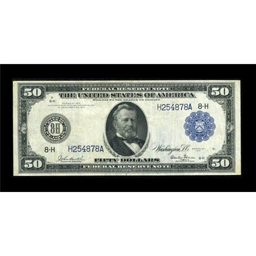 <B>Fr. 1053 $50 1914 Federal Reserve Note Very Fine.</B></I> A scarce note bearing the sought after Burke-Glass signature combination. It's a nice example with good color and even margins all around. <BR><BR><b>Shipping:</b> Coins & Currency (<a target="_blank" href="http://www.heritageauctions.com/common/shipping.php">view shipping information</a>)