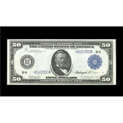 <B>Fr. 1054 $50 1914 Federal Reserve Note Choice New.</B></I> Lacking its paper originality but certainly not lacking in the eye appeal department. The margins are broad, and the colors are excellent. It's quite a scarce number, with just about two dozen examples known.