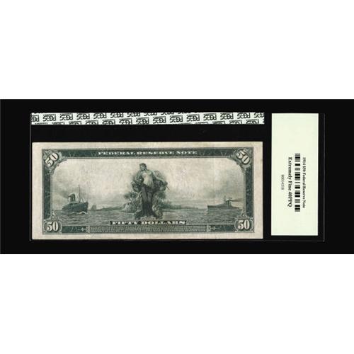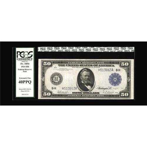 <B>Fr. 1054 $50 1914 Federal Reserve Note PCGS Extremely Fine 40PPQ.</B></I> After not seeing one of these on the market in four years tonight we offer two. This one is a lightly circulated example with soft folds and plenty of embossing visible through the holder.
