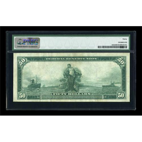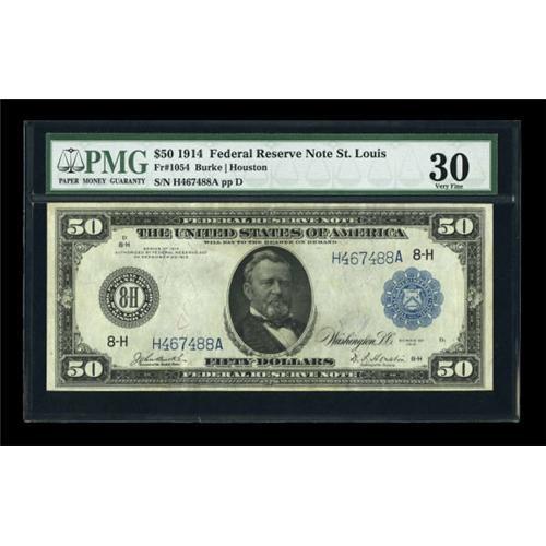 <B>Fr. 1054 $50 1914 Federal Reserve Note PMG Very Fine 30.</B></I> About 30 examples are recorded for this St. Louis $50 FRN. This nicely margined note has plenty of eye appeal.<BR><BR><b>Shipping:</b> Coins & Currency (<a target="_blank" href="http://www.heritageauctions.com/common/shipping.php">view shipping information</a>)