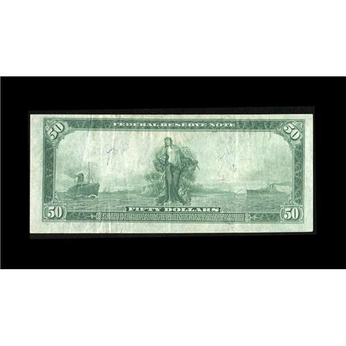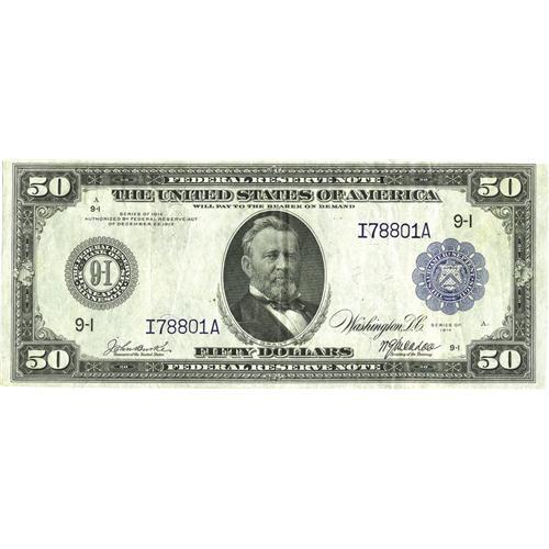 <B>Fr. 1056 $50 1914 Federal Reserve Note Very Fine+.</B></I> About 30 examples are known to exist from this tougher district. Much crispness remains and the margins are solid.