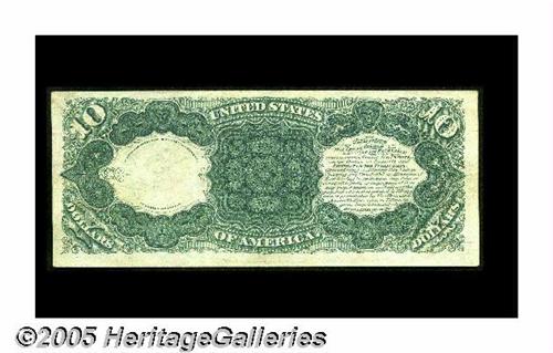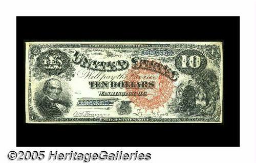<B>Fr. 106 $10 1880 Legal Tender About New.</B></I> Nice paper and strong embossing highlight this scarce Friedberg number that sports an engraver's locating line running approximately a half an inch up from the bottom margin.