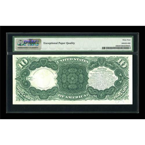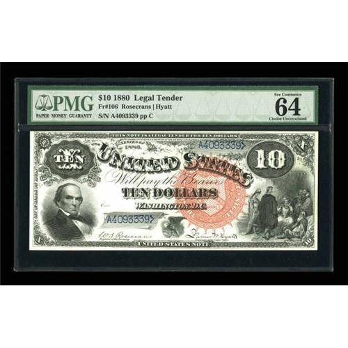 <B>Fr. 106 $10 1880 Legal Tender PMG Choice Uncirculated 64 EPQ.</B></I> This Large Red Spiked Seal Type is illustrated on page 87 of the Dauers' book - that illustration is not this note. This piece is a more recent acquisition and an upgrade of the example illustrated. The note has all the attributes of a perfect Gem save for the top margin, which comes a tad close at the left end. The colors are incredible and the original embossing of the paper is sufficiently deep for it to be easily seen through the third-party holder. Just less than a hundred examples of this note are known in all grades combined.<BR><I>From The Dr. Edward & Joanne Dauer Collection</B></I><BR><BR><b>Shipping:</b> Coins & Currency (<a target="_blank" href="http://www.heritageauctions.com/common/shipping.php">view shipping information</a>)