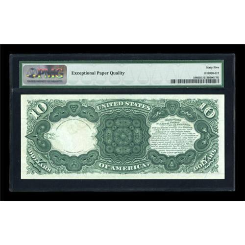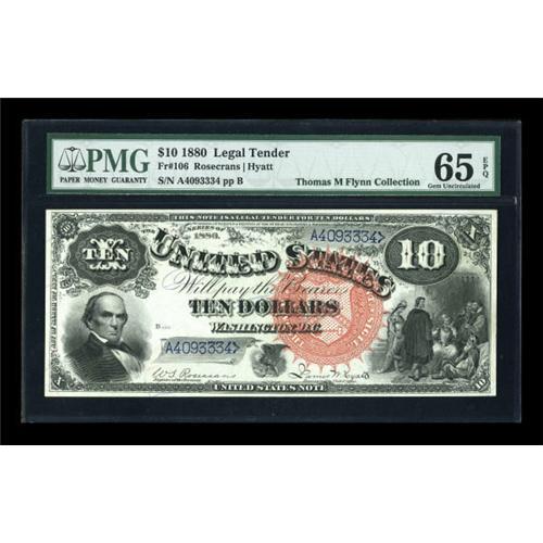 <B>Fr. 106 $10 1880 Legal Tender PMG Gem Uncirculated 65 EPQ.</B></I> Bright, flashy colors highlight this Large Spiked Red Seal Jackass Ten. The eye appeal is extraordinary, as are all the technical merits. The original embossing is easily seen, and the note is very well margined. PMG has given this note its "Exceptional Paper Quality" comment, and it certainly deserves it.<BR><I>From The Thomas M. Flynn Collection</B></I><BR><BR><b>Shipping:</b> Coins & Currency (<a target="_blank" href="http://www.heritageauctions.com/common/shipping.php">view shipping information</a>)