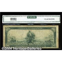 Fr. 1068 $50 1914 Federal Reserve Note CGA Very Fine 20. Another decent circulated piece from this small group of CGA-certified Fifty Dollar San Francisco Feds. <BR><BR><B>Important notice:</B> Heritage usually auctions material at the rate of 200-250 lots per hour. On some occasions eBay Live bid software or the Internet may not be able to keep up with the pace of the auction. We recommend placing a realistic absentee bid now as insurance to avoid disappointment. Occasionally the auctioneer may eliminate or reject an eBay Live bid, and the auctioneer may also reopen a lot after the close of the eBay live bidding (usually because we missed an audience bid), and may reject your bid even if it shows you as the winning bidder. By bidding via eBay Live, you agree that Heritage may award the lot to another bidder at its sole discretion under the circumstances described above or any other reasonable circumstances. Since eBay bids are not shown to us until we open the lot on the floor, we treat those bids just like floor bids. In most cases the floor responds before the eBay bid is presented to us, due to Internet lag time, so for consistency we have made it a policy that floor bids are always considered first over tie eBay live bids. Also please note that all Heritage lots purchased through eBay Live carry a 20% Buyer's Premium. Please make sure you read the Terms and Conditions before you bid. <BR><BR><B>IMPORTANT ANNOUNCEMENT ABOUT RESERVES:</B> Heritage now divulges all reserves on its web site 7 days before every auction. If you want to know whether the reserve on this lot has been met, and if not, what the reserve amount is, please visit this lot page on the HeritageCoin.com web site, or email: bid@HeritageGalleries.com