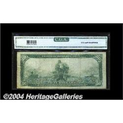 Fr. 1068 $50 1914 Federal Reserve Note CGA Very Fine 25. One of a number of near-identical pieces that we have to offer. <BR><BR><B>Important notice:</B> Heritage usually auctions material at the rate of 200-250 lots per hour. On some occasions eBay Live bid software or the Internet may not be able to keep up with the pace of the auction. We recommend placing a realistic absentee bid now as insurance to avoid disappointment. Occasionally the auctioneer may eliminate or reject an eBay Live bid, and the auctioneer may also reopen a lot after the close of the eBay live bidding (usually because we missed an audience bid), and may reject your bid even if it shows you as the winning bidder. By bidding via eBay Live, you agree that Heritage may award the lot to another bidder at its sole discretion under the circumstances described above or any other reasonable circumstances. Since eBay bids are not shown to us until we open the lot on the floor, we treat those bids just like floor bids. In most cases the floor responds before the eBay bid is presented to us, due to Internet lag time, so for consistency we have made it a policy that floor bids are always considered first over tie eBay live bids. Also please note that all Heritage lots purchased through eBay Live carry a 20% Buyer's Premium. Please make sure you read the Terms and Conditions before you bid. <BR><BR><B>IMPORTANT ANNOUNCEMENT ABOUT RESERVES:</B> Heritage now divulges all reserves on its web site 7 days before every auction. If you want to know whether the reserve on this lot has been met, and if not, what the reserve amount is, please visit this lot page on the HeritageCoin.com web site, or email: bid@HeritageGalleries.com