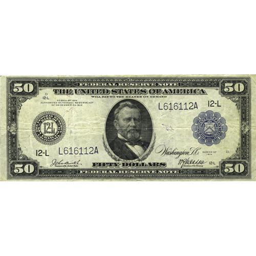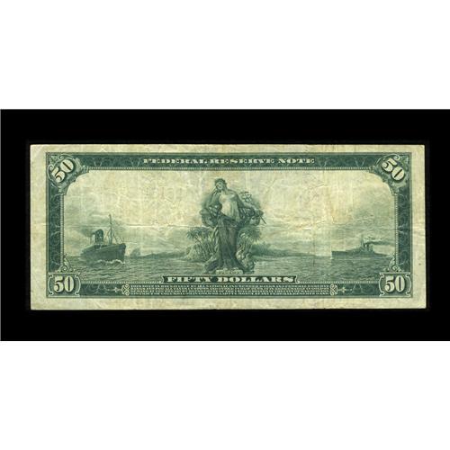 <B>Fr. 1068 $50 1914 Federal Reserve Note Fine-Very Fine.</B></I> This $50 is bright for the grade with even handling. A few pinholes are also noticed.