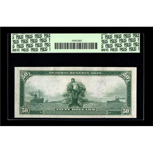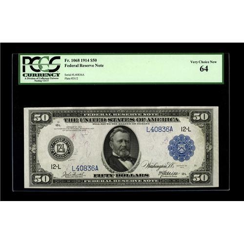 <B>Fr. 1068 $50 1914 Federal Reserve Note PCGS Very Choice New 64.</B></I> While lower grade examples of this Friedberg number hardly rank as scarce, uncirculated specimens are just plain rare, with just three such notes listed in the Gengerke census, one of which is impounded in the collection of the San Francisco Federal Reserve Bank while another, graded "uncirculated," was offered in an internet auction in 2000 and has not been seen since. This attractive piece bears the grade of Very Choice New 64 awarded by PCGS, and may well be the finest Fr. 1068 to exist. If rarity is any guide here, expect a realization in the range of...<BR><BR><b>Shipping:</b> Coin/Currency (<a target="_blank" href="http://www.heritageauctions.com/common/shipping.php">view shipping information</a>)