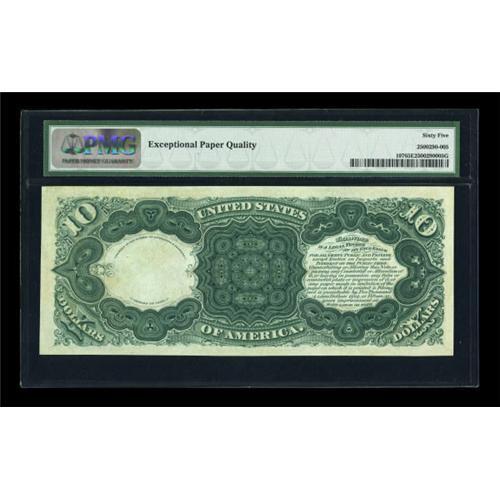 <B>Fr. 107 $10 1880 Legal Tender PMG Gem Uncirculated 65 EPQ.</B></I> Friedberg 107's are an ideal way to own a perfectly original Gem example of this popular type since they are usually more available than other issues. This Large Orange Seal Jackass Ten has strikingly bold original embossing and excellent color. But for a slightly tight bottom margin it would rate the full Gem grade.<BR><BR><b>Shipping:</b> Coins & Currency (<a target="_blank" href="http://www.heritageauctions.com/common/shipping.php">view shipping information</a>)