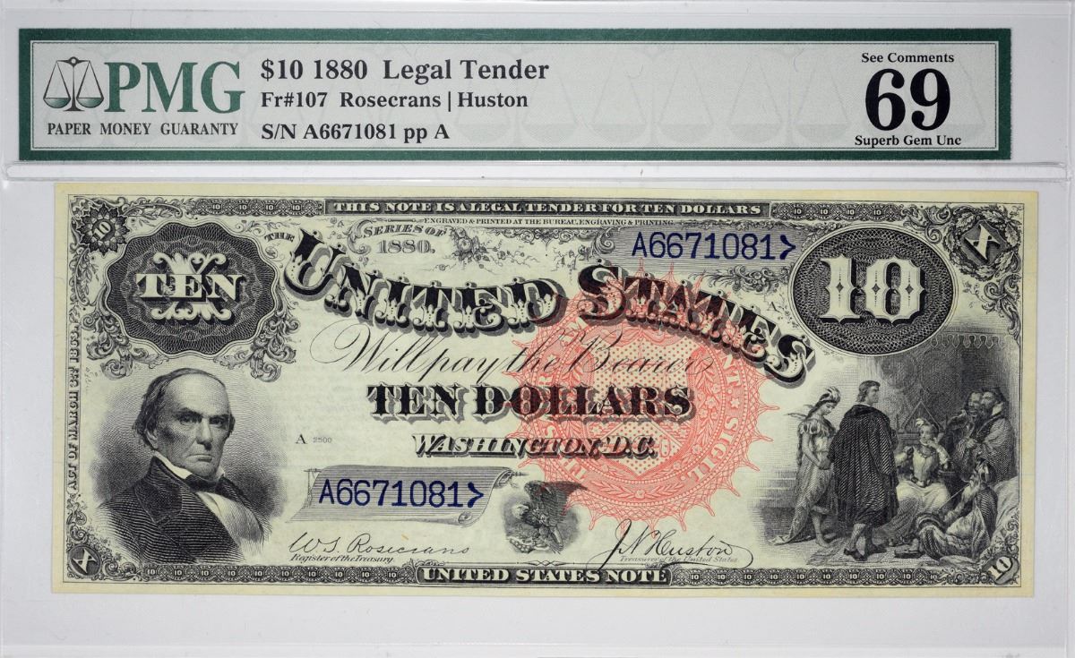 Fr. 107. 1880 $10 Legal Tender Note. PMG Superb Gem Uncirculated 69 EPQ.