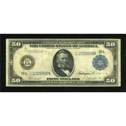 <B>Fr. 1070 $50 1914 Federal Reserve Note Fine.</B></I> This $50 has an interesting countdown serial number - L 100 99 98 A.<BR><BR><b>Shipping:</b> Coins & Currency (<a target="_blank" href="http://www.heritageauctions.com/common/shipping.php">view shipping information</a>)