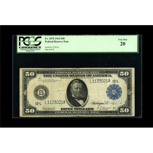 <B>Fr. 1070 $50 1914 Federal Reserve Note PCGS Very Fine 20.</B></I> Less than thirty examples are known for this San Francisco issue.<BR><BR><b>Shipping:</b> Coins & Currency (<a target="_blank" href="http://www.heritageauctions.com/common/shipping.php">view shipping information</a>)