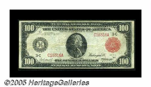 <B>Fr. 1074b $100 1914 Red Seal Federal Reserve Note Very Fine.</B></I> The census includes only about 20 of this scarce number. Scarcer signature combinations within the larger Federal Reserve Note design types have become the object of much more intense buyer attention over the past few years as collecting patterns have shifted away from purely type-based preferences. We expect this problem-free-middle grade circulated $100 Red Seal will easily surpass...