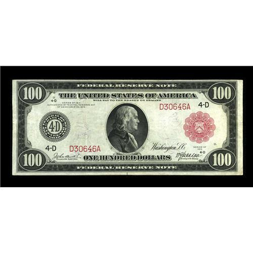 <B>Fr. 1075b $100 1914 Red Seal Federal Reserve Note Very Fine.</B></I> This note is a solid issue with no paper problems to speak of. The seal is sufficiently bold as are the serial numbers. To date only about twenty examples are known extant. The last example we handled was a similar looking Very Fine. That piece realized more than $6,000 and we expect this issue to receive the same attention tonight.<BR><I>From The Bill and Kathy Stella Currency Collection</B></I><BR><BR><b>Shipping:</b> Coin/Currency (<a target="_blank" href="http://www.heritageauctions.com/common/shipping.php">view shipping information</a>)