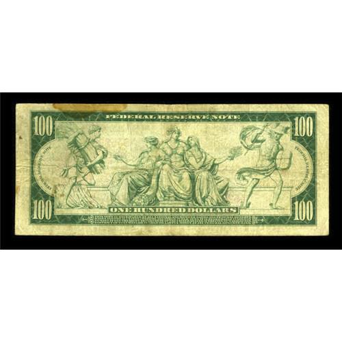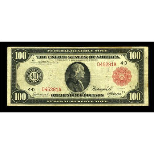 <B>Fr. 1075b $100 1914 Red Seal Federal Reserve Note Fine-Very Fine.</B></I> An extremely scarce note with fewer than two dozen examples known in all grades combined. This piece is new to the census. It's brightly colored and well centered, but does have a stain at the top margin which, fortunately, is not terribly distracting. Expect bidding to reach or exceed...<BR><BR><b>Shipping:</b> Coins & Currency (<a target="_blank" href="http://www.heritageauctions.com/common/shipping.php">view shipping information</a>)