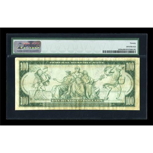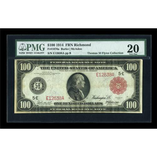 <B>Fr. 1076a $100 1914 Red Seal Federal Reserve Note PMG Very Fine 20.</B></I> Including this piece, fourteen examples are listed in the Track & Price census, none of which grades better than XF. This one is a solid VF, with good color, no problems and a nice overall appearance. This is the first Fr. 1076a that Heritage-CAA has handled.<BR><I>From The Thomas M. Flynn Collection</B></I><BR><BR><b>Shipping:</b> Coins & Currency (<a target="_blank" href="http://www.heritageauctions.com/common/shipping.php">view shipping information</a>)