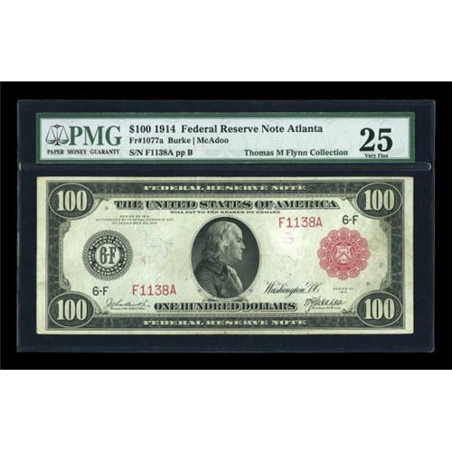 <B>Fr. 1077a $100 1914 Red Seal Federal Reserve Note PMG Very Fine 25.</B></I> This note is one of the eight on the census. We've sold three of those eight, but none more recently than January of 2001. This is the first 1077a that has been available since 2003, when another VF realized $3738. The note has wonderful margins, a bright red overprint and no flaws at all save for the normal circulation expected in the VF 25 grade. Rare and attractive.<BR><I>From The Thomas M. Flynn Collection</B></I><BR><BR><b>Shipping:</b> Coins & Currency (<a target="_blank" href="http://www.heritageauctions.com/common/shipping.php">view shipping information</a>)