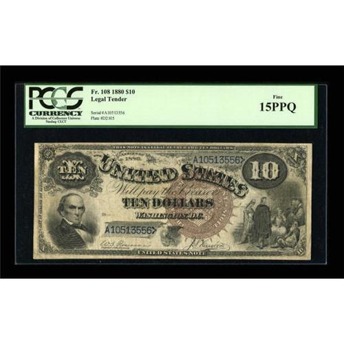 <B>Fr. 108 $10 1880 Legal Tender PCGS Fine 15PPQ.</B></I> Exceptional color is noted on this moderately circulated issue. The paper is solid and perfectly original.<BR><I>From The Kansas City Collection.</B></I><BR><BR><b>Shipping:</b> Coins & Currency (<a target="_blank" href="http://www.heritageauctions.com/common/shipping.php">view shipping information</a>)