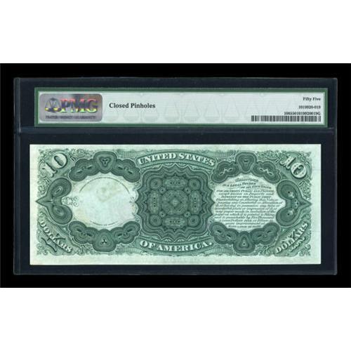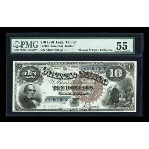<B>Fr. 108 $10 1880 Legal Tender PMG About Uncirculated 55.</B></I> PMG has commented, "Closed pinholes," and indeed they are correct. We can spot three, though all are rather unobtrusive, and they do little to take away from the eye appeal of this Large Brown Seal Blue Serial Number Jackass Ten. Its type-mate, Fr. 109, is so rare as to be uncollectible, making this in essence a one-number type.<BR><I>From The Thomas M. Flynn Collection</B></I><BR><BR><b>Shipping:</b> Coins & Currency (<a target="_blank" href="http://www.heritageauctions.com/common/shipping.php">view shipping information</a>)